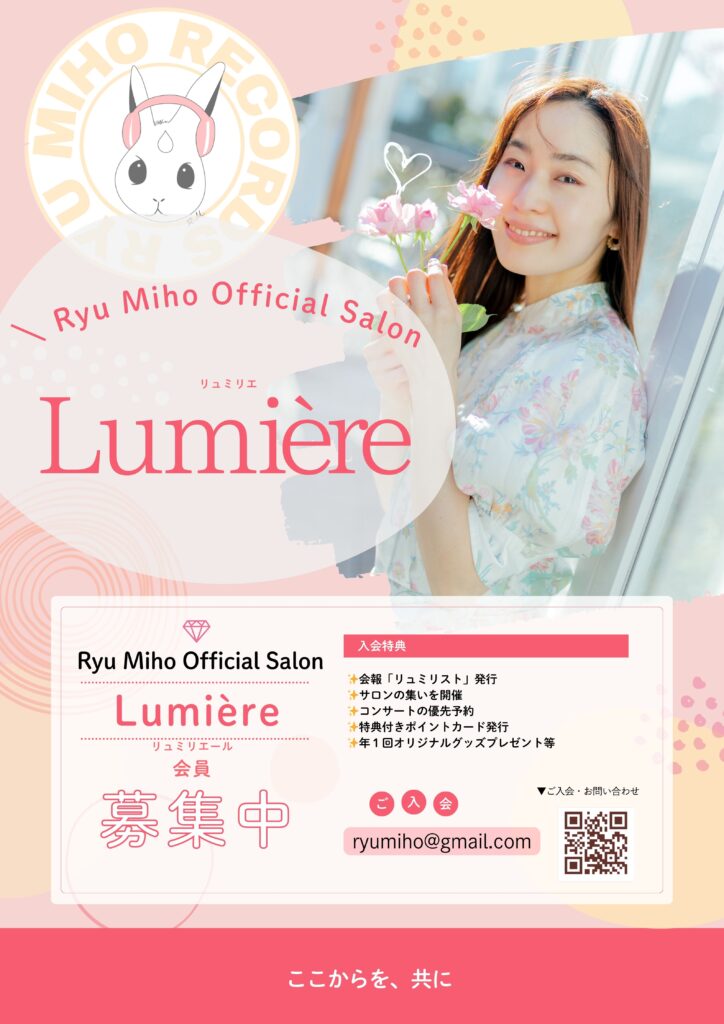 | 1 会報「リュミリスト」発行 2 ファンクラブの集いを開催 3 コンサートチケットの優先予約 4 特典付きポイントカード 5 ポイントカード10ポイント達成ごとに景品をプレゼント ※「ポイント付与を事前にお知らせするコンサート・イベントなど」に限られます。 など色々楽しいことをみんなで作っていきたいと思います。 ご興味のある方はぜひご連絡ください。 <ご入会・お問い合わせ> ryumiho@gmail.com |